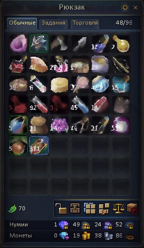 - С помощью 1 "Большого рюкзака" можно расширять инвентарь первые 5 раз (до 60 ячеек).